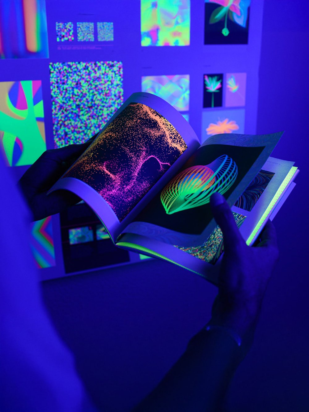 The Hello Fluo project is a unique blend of digital and analog technologies: coded visuals are created on computers and translated onto paper using a traditional offset printing press.